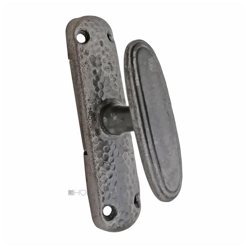 Basküle Fensterolive alt Hammerschlag oval Stahl Bauhaus Art Deco Einreiber links