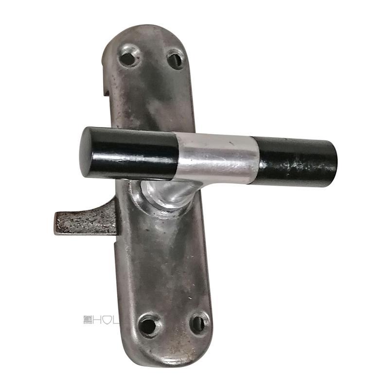 Basküle aus den 1920er Jahren . Rückseitig ist der Antrieb für zwei 14 mm flach-, halbrunde Triebstangen vorhanden und beim Verschließen fährt links der Einreiber aus .
