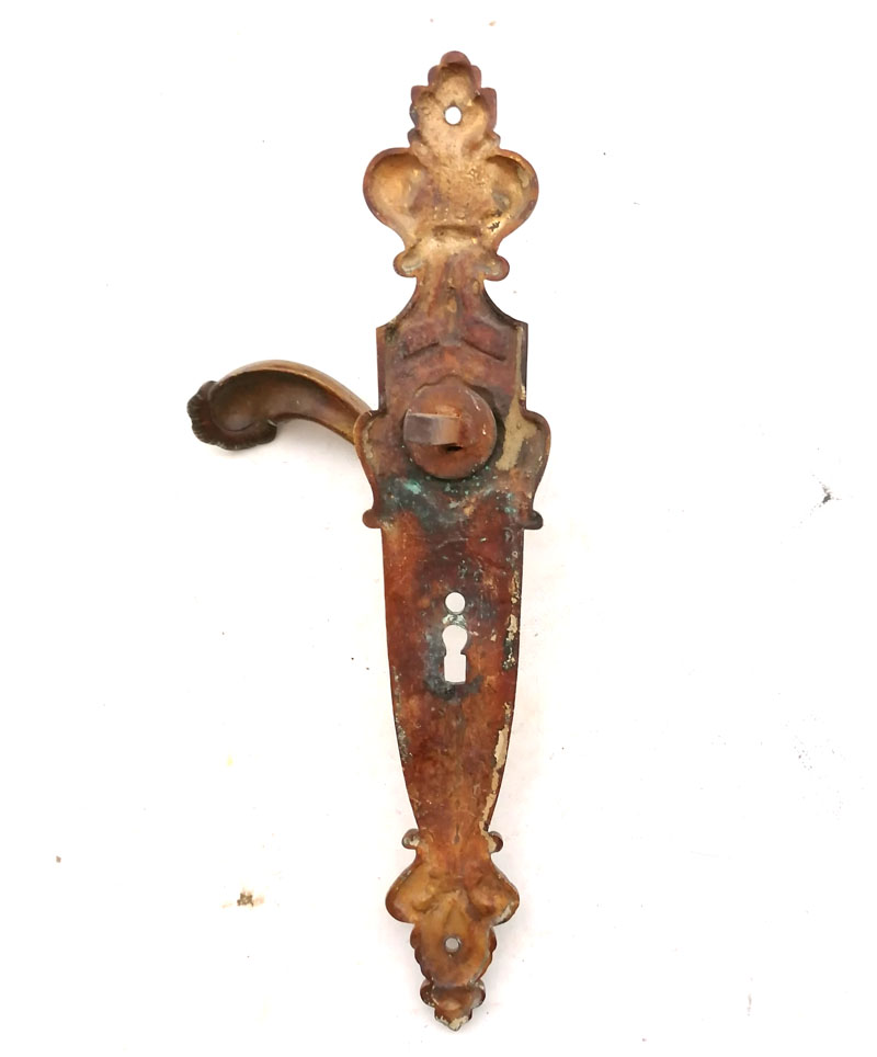 Gründerzeit Langschild antik mit Türdrücker neo barock Messing 8er Vk 68 mmGründerzeit Langschild antik mit Türdrücker neo barock Messing 8er Vk 68 mm