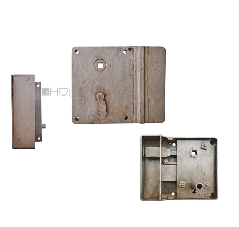Ein Kastenschloss aus der Zeit um 1905 , ohne Schlüssel und Handschiebehebel .